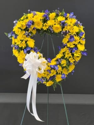 This standing heart wreath includes all bright yellow flowers accented by bright greenery.